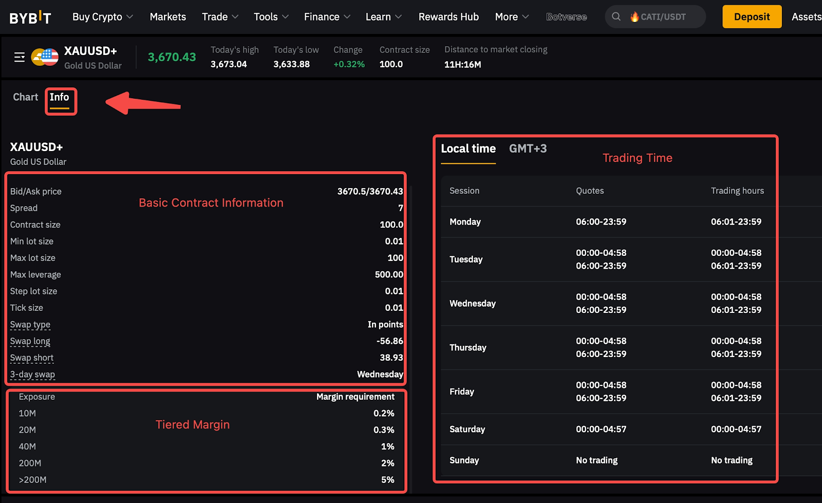 You can view the charts and account details directly on the trading page and check the contract specifications by clicking the [Info] label.
