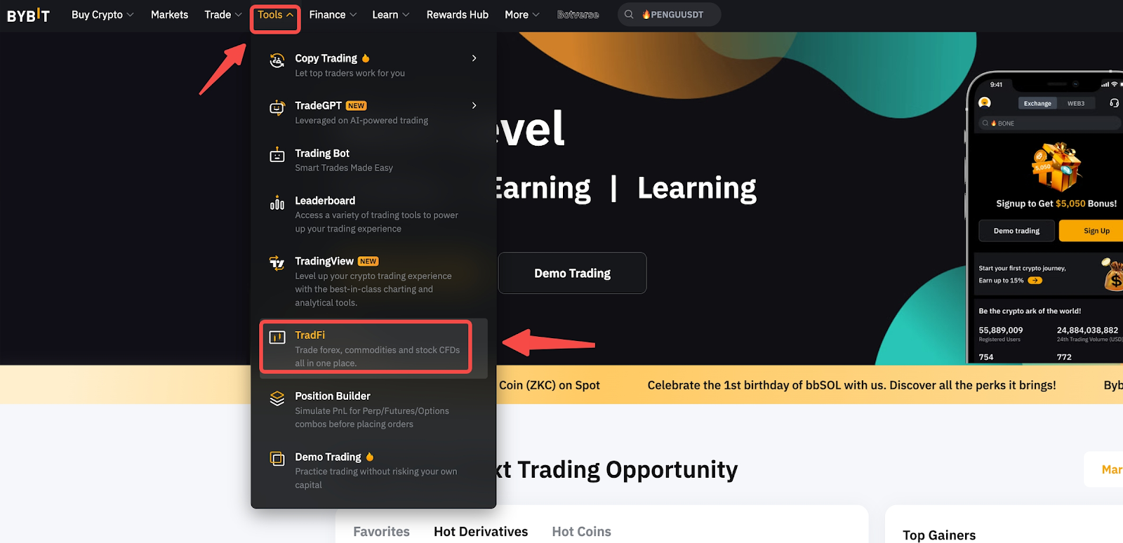 Step 1: Log in to your Bybit account and hover your curser over Tools on navigate bar, then click on TradFi.