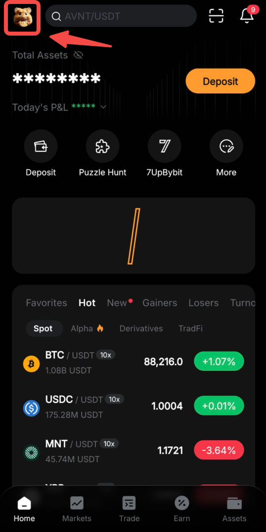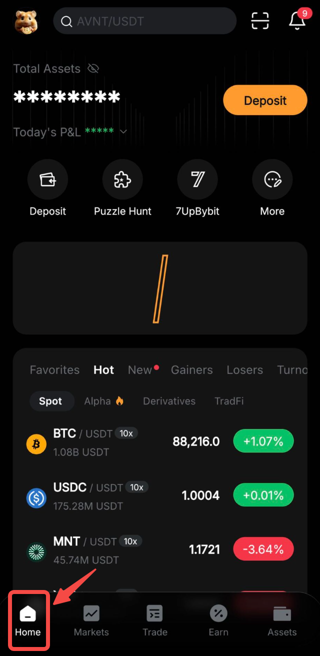 Paso 1: Abre la aplicación de Bybit. En la esquina inferior izquierda, selecciona “Inicio”.