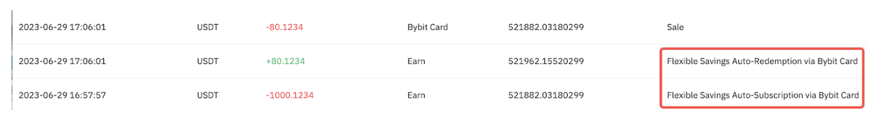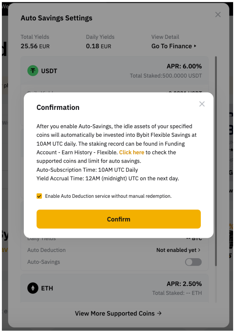 Además, puedes ganar intereses compuestos sobre tus ahorros flexibles (no disponibles directamente en la página de ahorros de Bybit) habilitando la deducción automática en el panel de tu tarjeta Bybit.