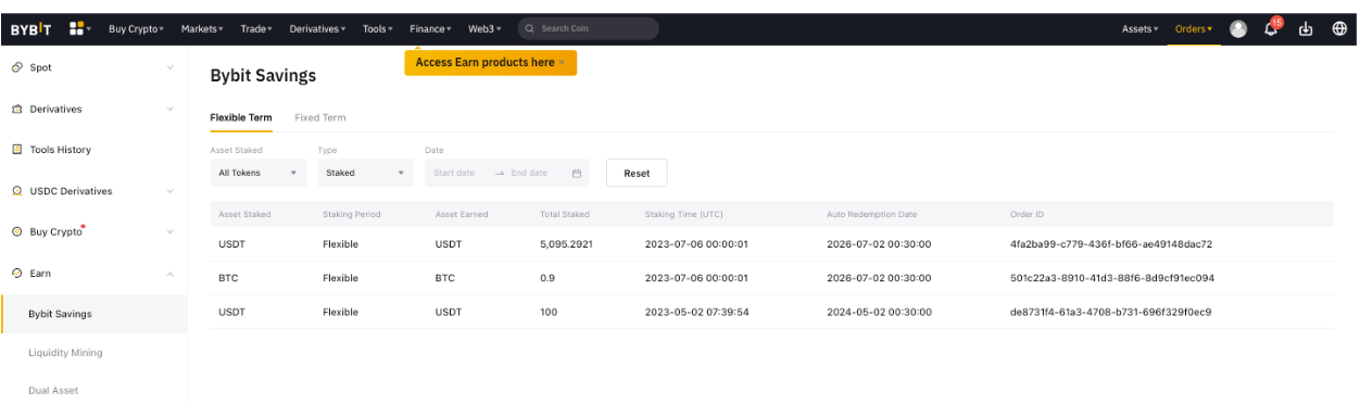 Además, también puedes encontrar los registros de tu orden en Ganar orden → Ahorros Bybit.