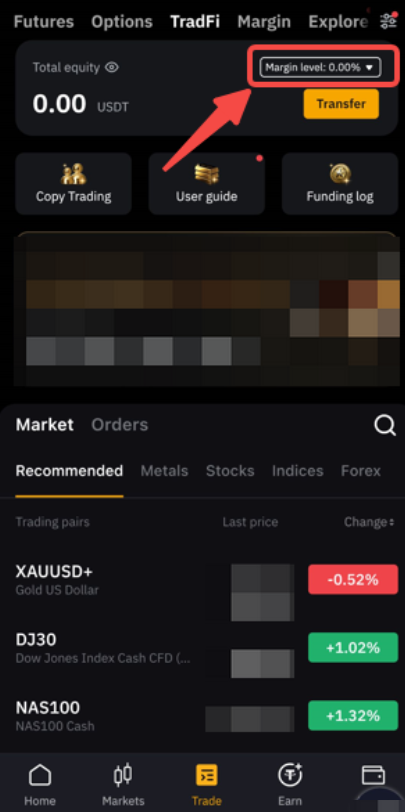 El nivel de margen para TradFi (MT5) en la aplicación móvil de Bybit se puede encontrar en la pestaña Trades que se muestra a continuación.