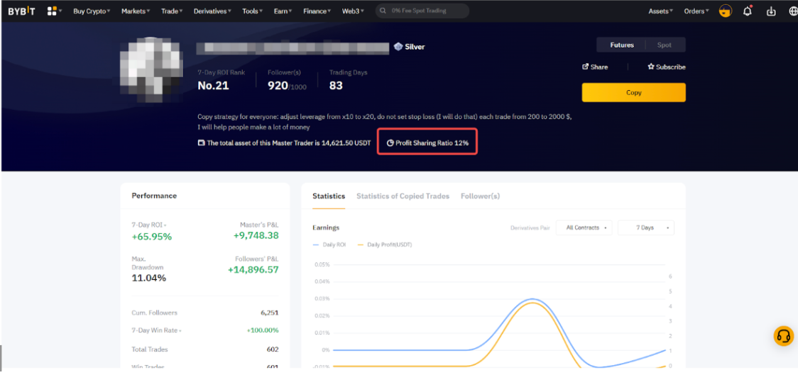 Como master trader en Bybit, puedes compartir una parte de los beneficios netos obtenidos por cada uno de tus seguidores. Por el contrario, como seguidor, tendrás que compartir una parte de los beneficios de tu posición con tu master trader.