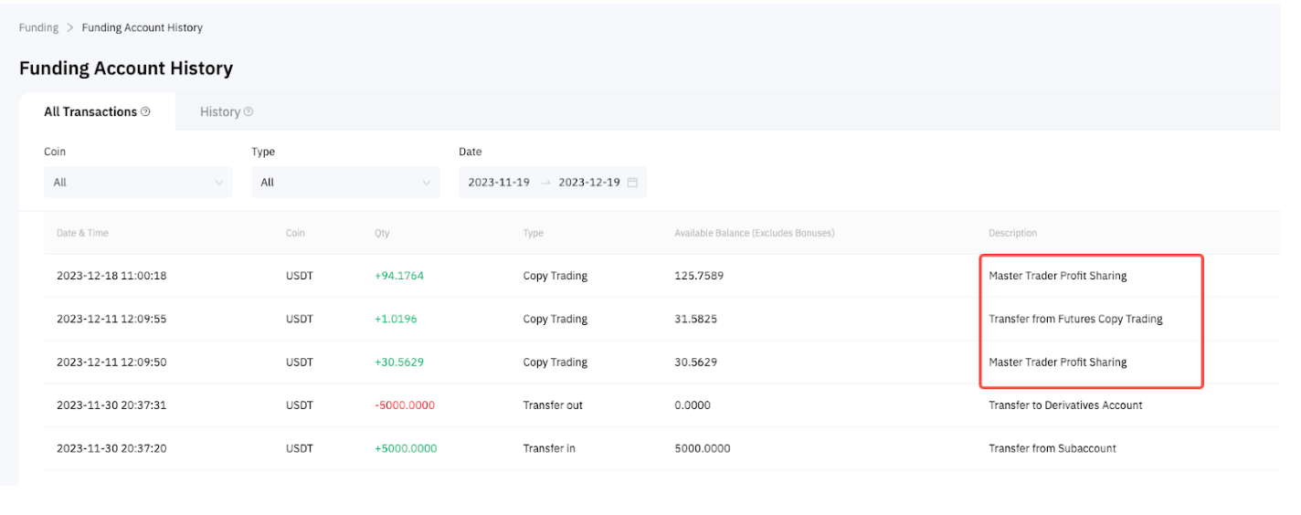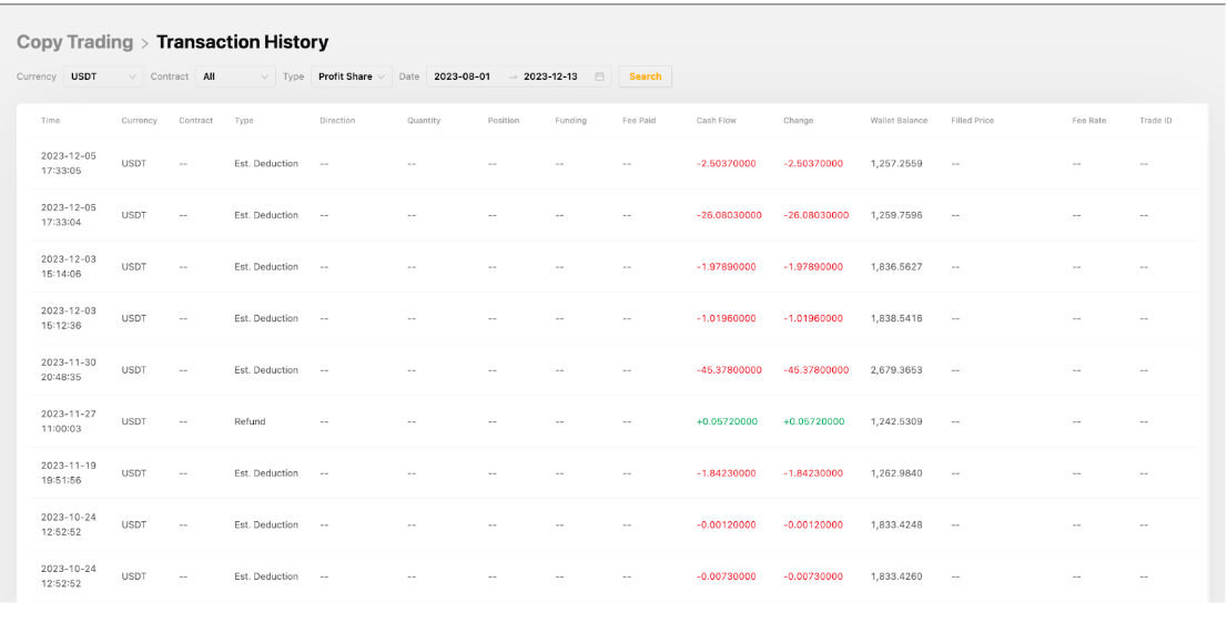 Puedes ver el registro de deducciones y reembolsos en la página Historial de transacciones de copy trading.