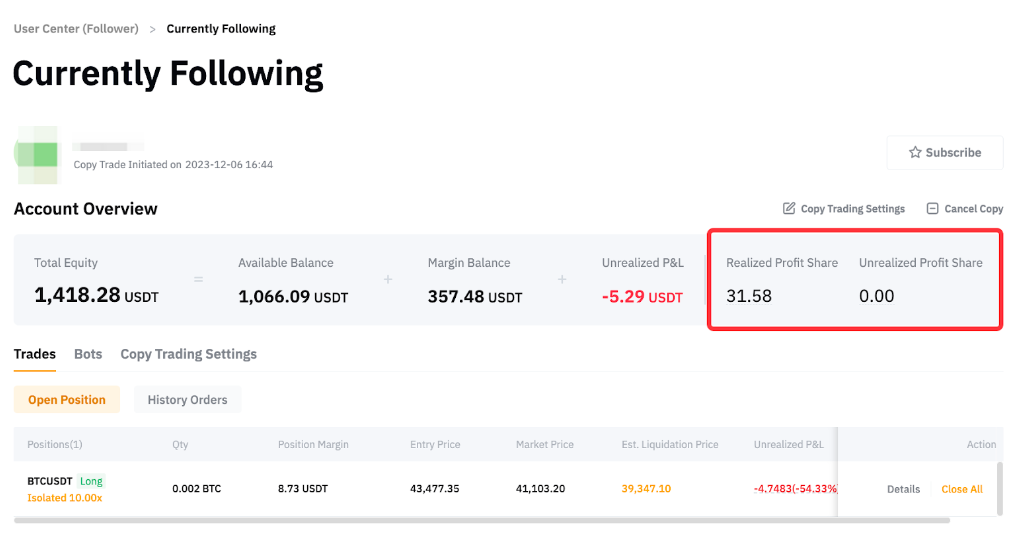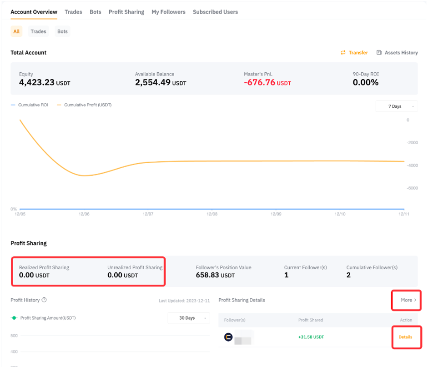 Detalles del reparto de ganancias: Haz clic en Detalles junto a tus seguidores y podrás ver los detalles de reparto de ganancias de posiciones de USDT perpetuos y trading bots.