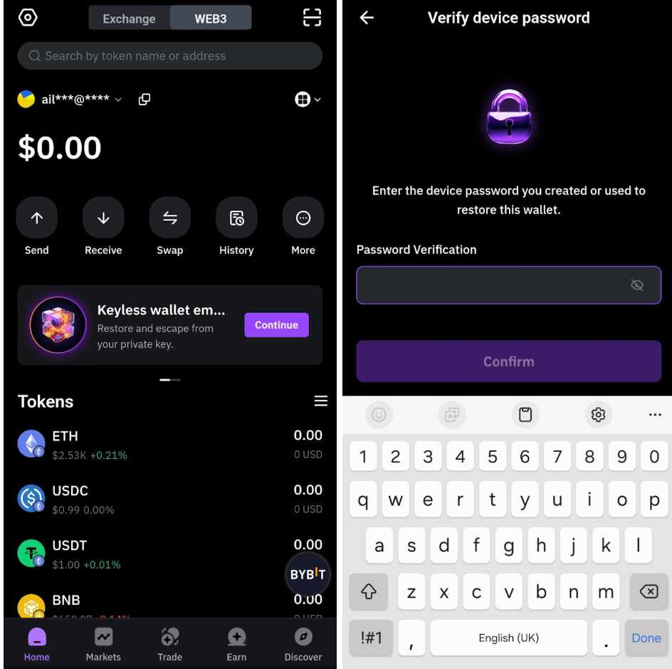 Inicie sesión en App MPC (Keyless Wallet), verás un banner en Billetera. Toca Continuar en el banner Escapada de emergencia con clave privada y verifica con la contraseña de tu dispositivo.