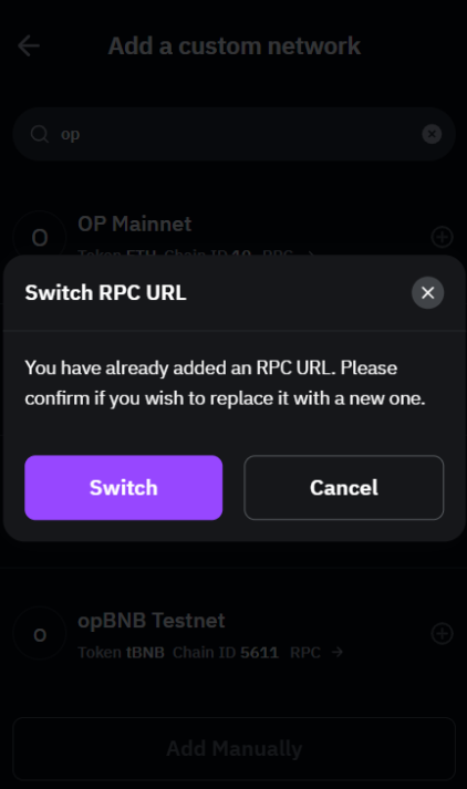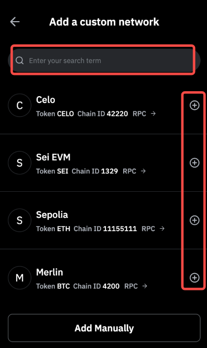 Paso 2: Introduce un nombre de red válido y, una vez que hayas encontrado la red, toca el icono + para añadirlo a tu billetera.