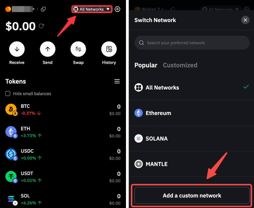 Paso 1: Para añadir una red personalizada, abre la extensión Bybit Wallet y haz clic en Todas las redes → Añadir una red personalizada.