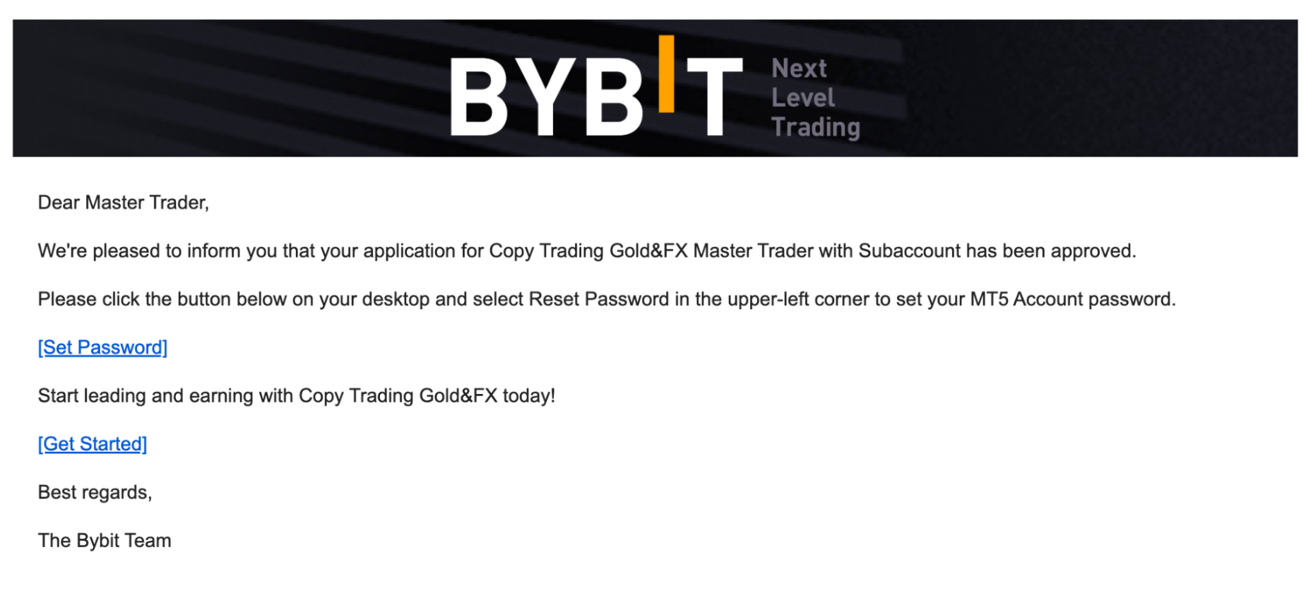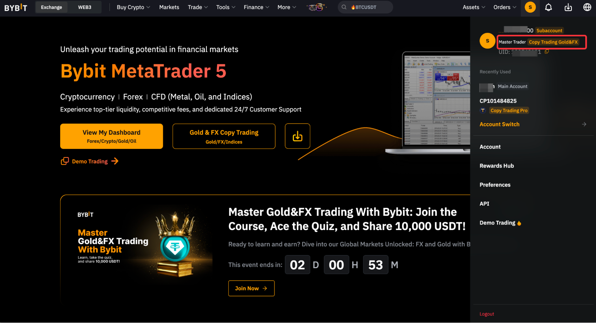 ¡Enhorabuena! Ya eres un Master Trader de TradFi . Cambia a tu subcuenta de Master Trader de TradFi y a tu cuenta de MT5 para empezar a usar Copy Trading.