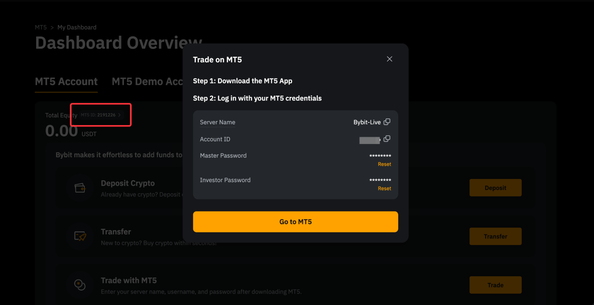 Paso 5: ve a tu panel de TradFi MT5 e inicia sesión en tu cuenta de MT5 con tus credenciales.