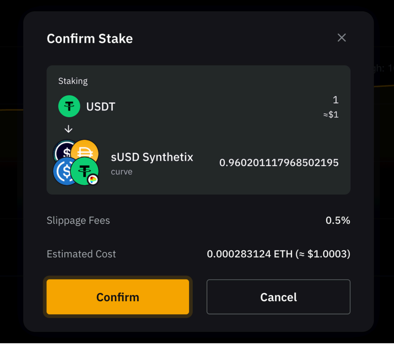 Paso 2: En la ventana emergente, verifica los detalles de tu orden de staking. Toma nota del deslizamiento y el coste estimado, y haz clic en Confirmar.