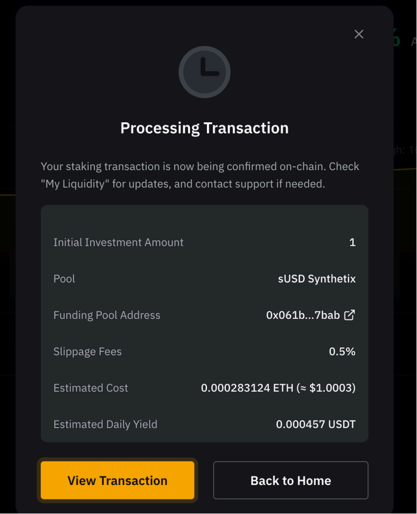 Paso 3: Aparecerá una ventana emergente para indicar que la transacción se está procesando. Una vez completada la transacción, puedes ver tu transacción haciendo clic en el botón Ver transacción.