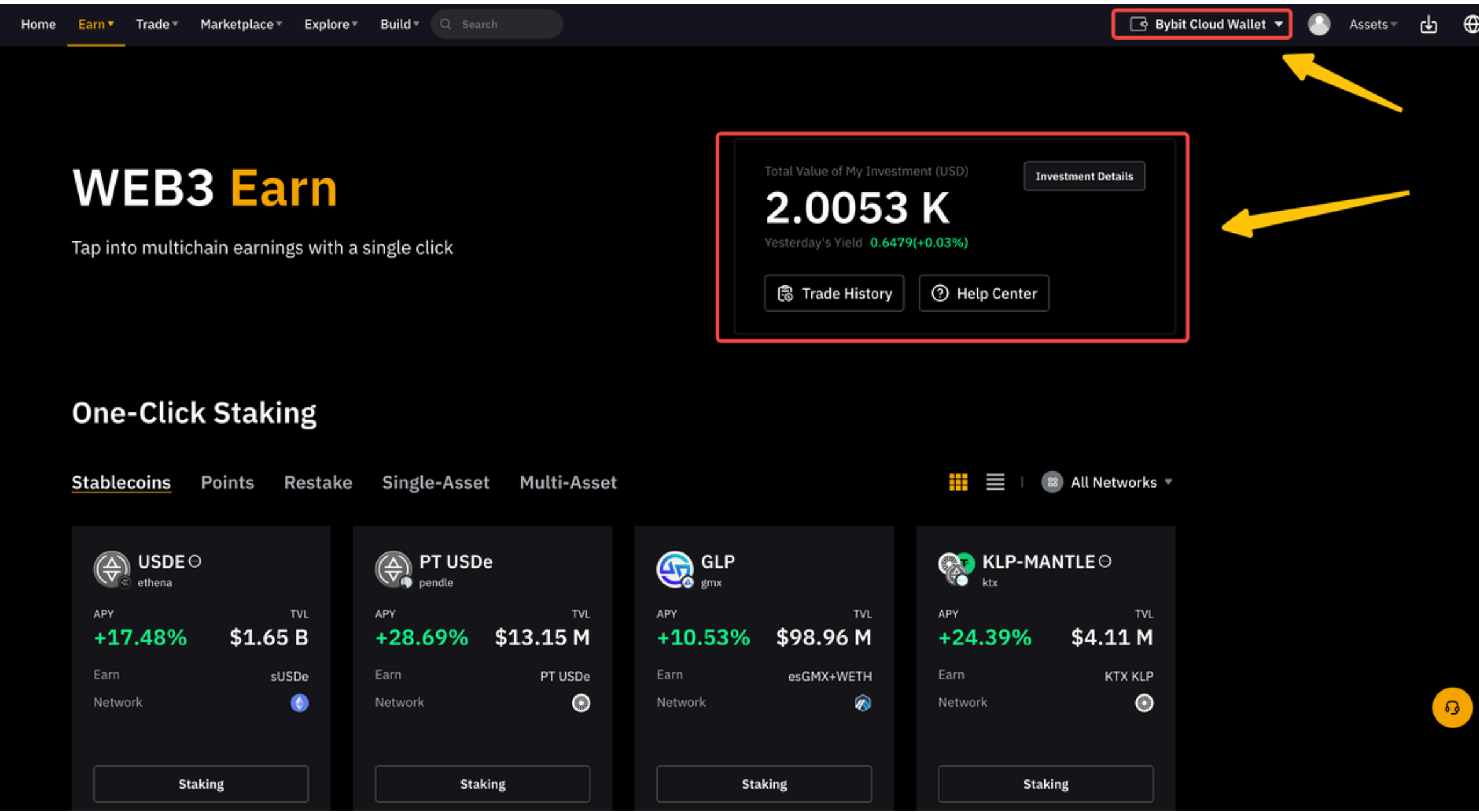 Después de conectar tu billetera, el valor total de tu inversión de todos los fondos de staking se mostrará en el panel de control en la esquina superior derecha.