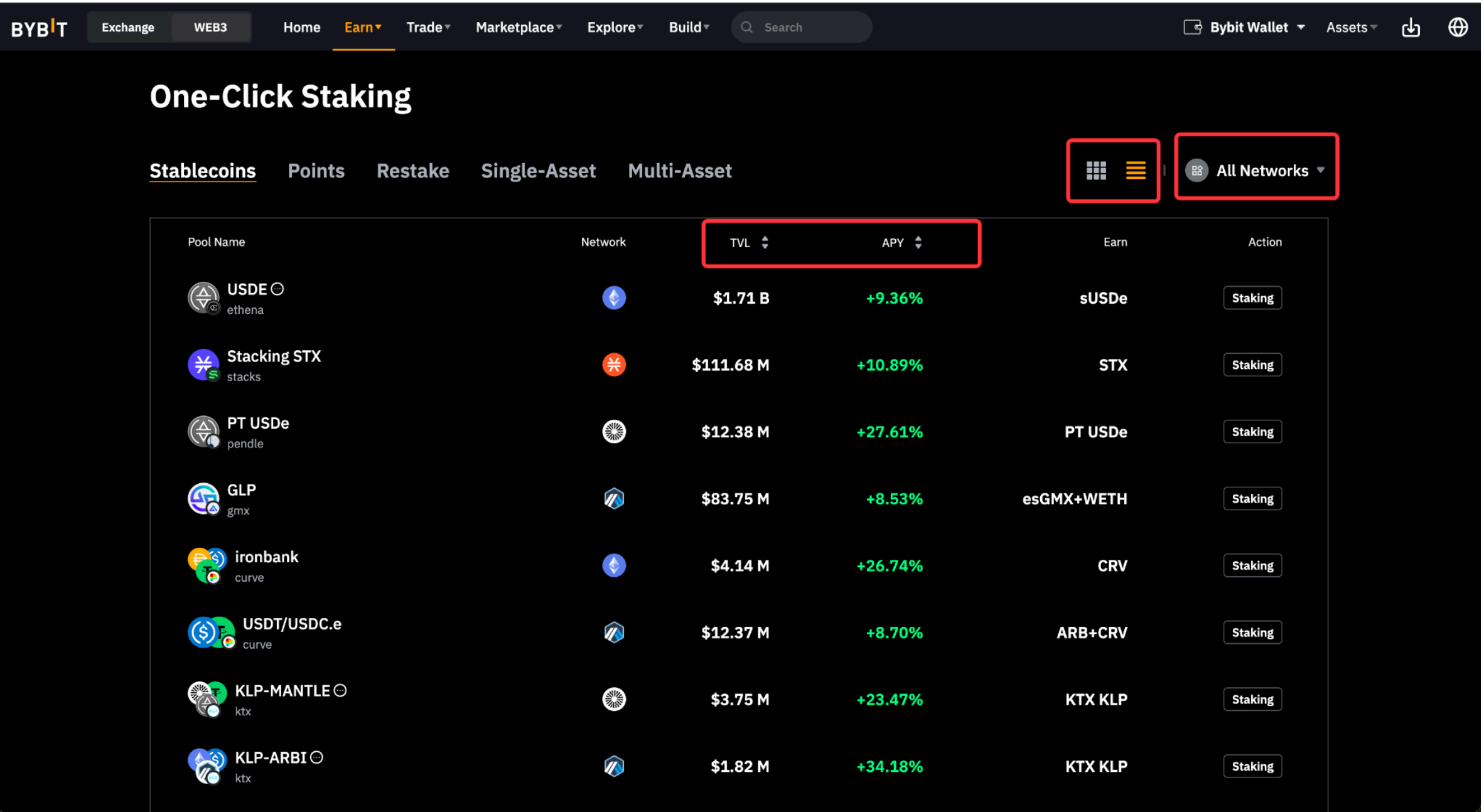 Paso 1: En la página Staking, puedes ver todos los fondos de staking disponibles. Haz clic en el icono de cuadrícula o lista para ajustar la visualización. Puedes organizar los fondos de acuerdo con APR o TVL, o hacer clic en Todas las redes, y ver los fondos de staking por red.