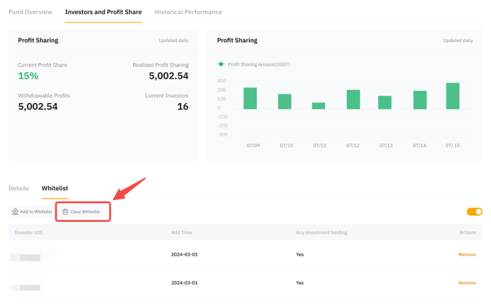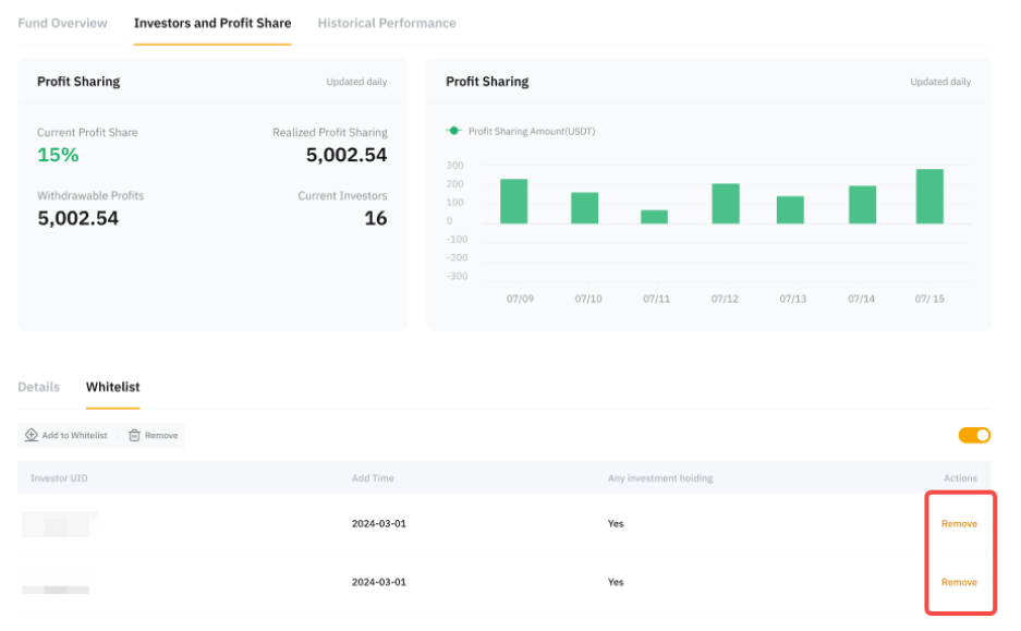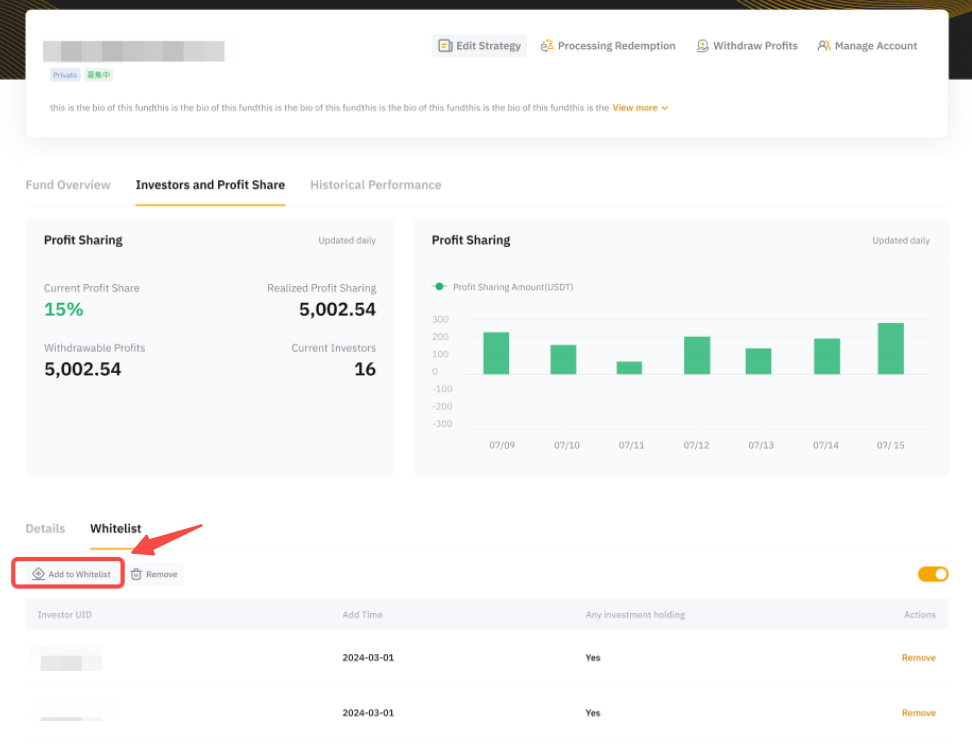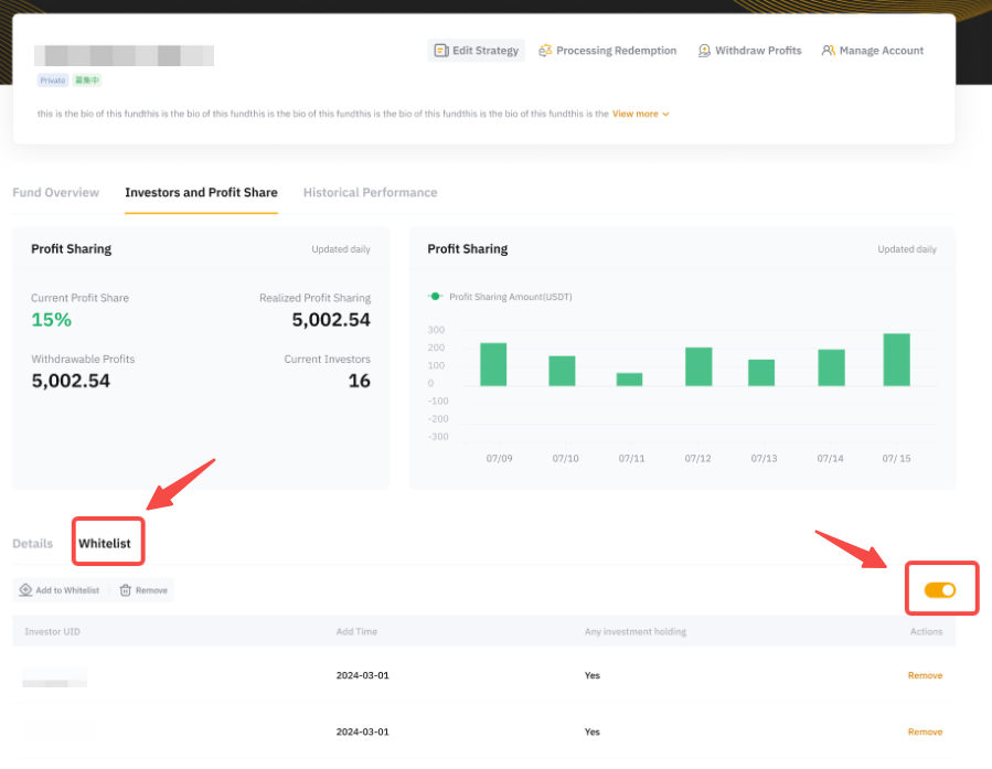 • Solo los usuarios incluidos en la lista blanca podrán invertir en tus estrategias. Los usuarios que no estén en la lista blanca ya no podrán convertirse en tus inversores.