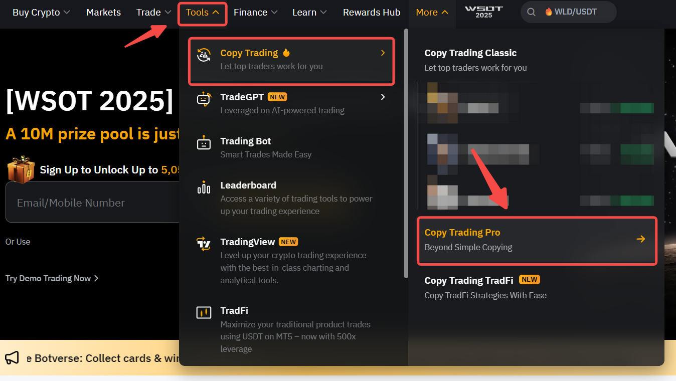 Paso 1: Inicia sesión en el sitio web de Bybit y haz clic en Herramientas → Copy Trading → Copy Trading Pro en la barra de navegación.