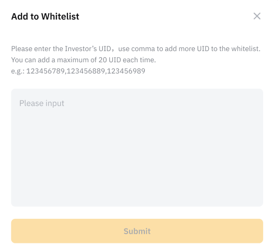 — Puedes importar hasta 20 UIDs a la vez. No hay límite para el número total de inversores incluidos en la lista blanca.