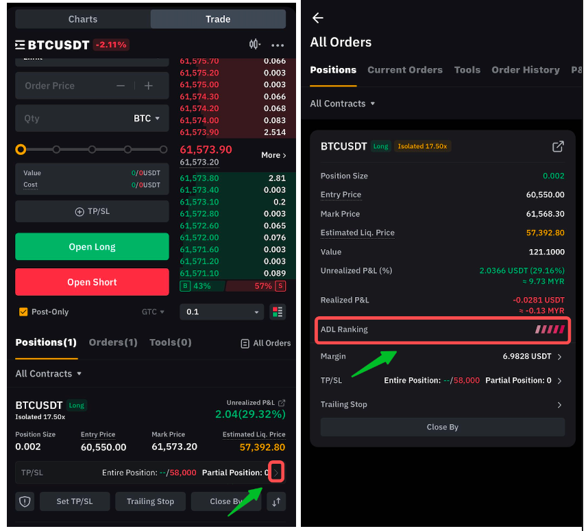 レバレッジの高いポジションを部分的に決済することで、ADLリスクにさらされる契約数を減らすことができます。ただし、ADLランキングが下がるわけではありません。