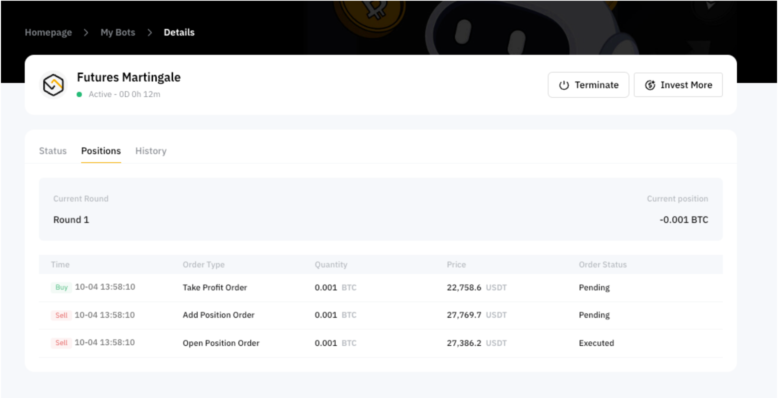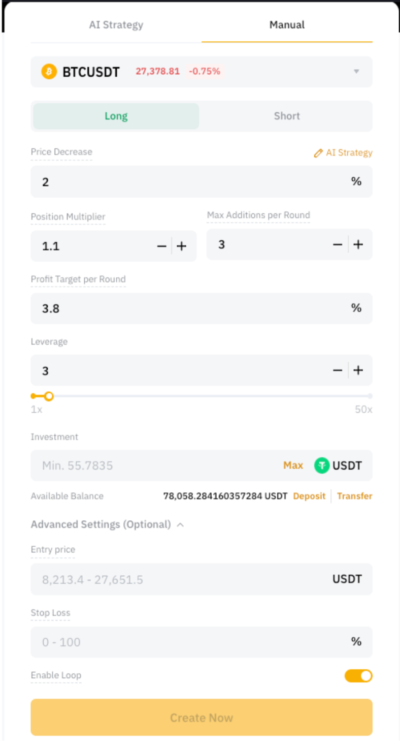 たとえば、ロングのマーチンゲール取引ボットの当初参入価格が10,000ドルで、「価格下落率」が1%に設定されていたとします。価格が1%下落して9,900ドルになると、既存ポジションのトリガーが作動し、取引を成立させます。