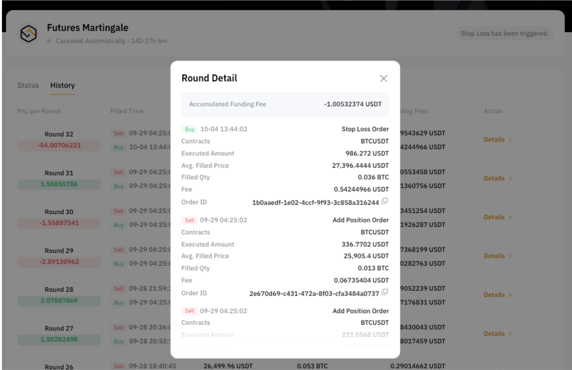ボット履歴ページには、これまでのラウンドの実現損益の詳細が表示されます。「詳細」をクリックすると、各ラウンドの注文履歴と累積手数料が表示されます。