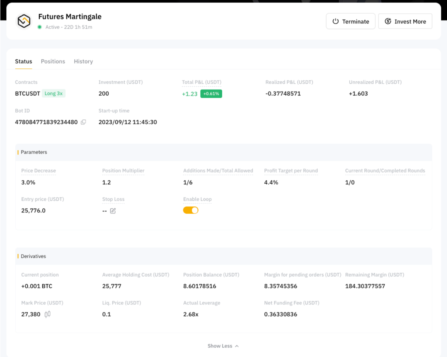 ボット詳細ページでは、設定したパラメータなど、先物マーチンゲール取引ボットの包括的な情報をご覧いただけます。これらの設定に加え、注意すべき重要な情報も表示されています。
