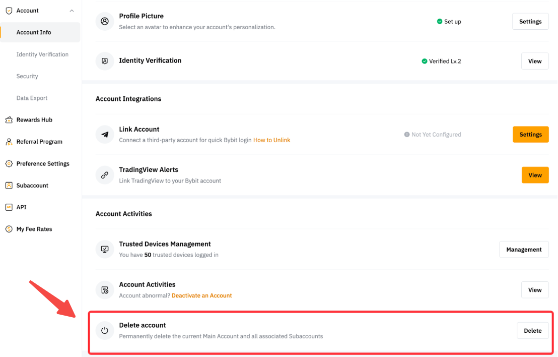Bybitは、セルフサービスによるアカウント削除機能を導入しました。この機能を利用すると、アカウント&セキュリティページからアカウントを自分で削除できます。