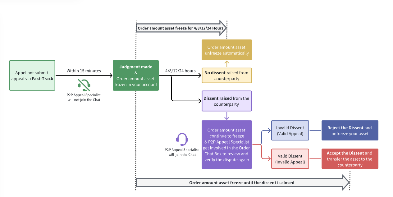 ファストトラックオプションで異議申し立てを提出する場合、15分以内に判断が下され、P2P異議申し立てスペシャリストは注文チャットボックスに参加しません。判定完了後、注文金額は4時間、8時間、12時間、または24時間一時的に禅され、取引相手が結果を確認できるようになります。凍結期間は戦略によって異なります。特定の凍結期間については、インターフェースを参照してください。