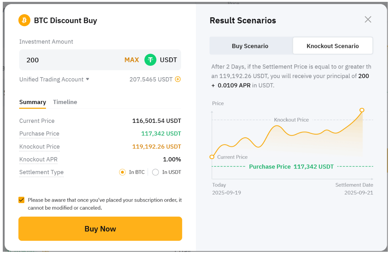 Settle in USDT: If a crypto purchase is triggered, you will buy BTC at the Purchase Price and then sell it at the Settlement Price, with the payoff settled in USDT.