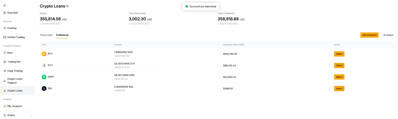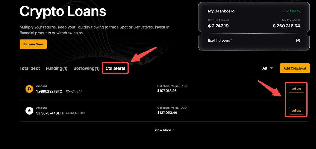 Step 1: Click on Adjust under the Collateral tab on the Crypto Loan page.