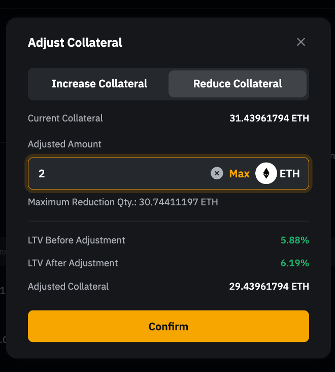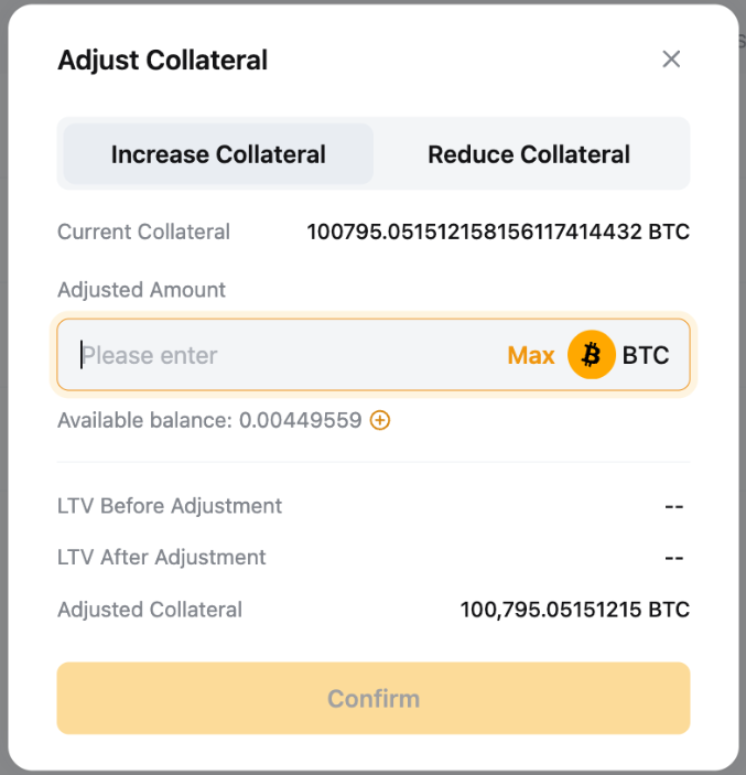 Step 2: Adjust the collateral amount, and you will see the LTV change under LTV After Adjustment.