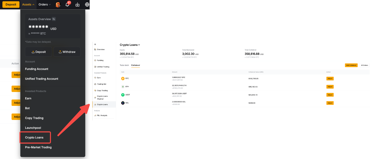 Alternatively, click on AssetsCrypto Loans in the upper right corner of the page. Under the Crypto Loans tab, click on Adjust Collateral Amount in the column where you want to adjust.