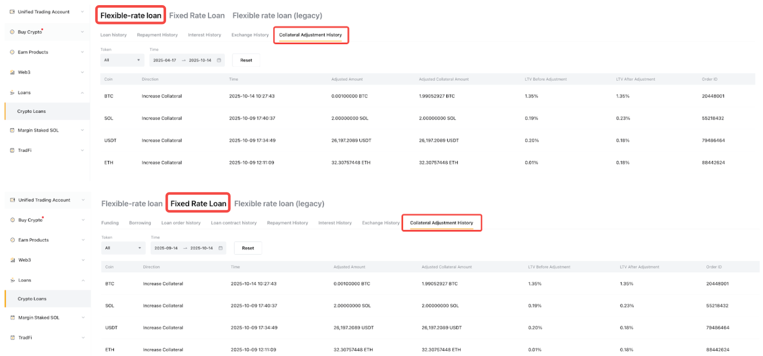 • Margin Call LTV: When the LTV ratio is higher than the Margin Call LTV ratio, you’ll receive a notification via email, SMS and a Push to remind you to deposit or transfer more collateral to your Funding Account or Unified Trading Account, or repay the borrowed coins to lower your LTV ratio.