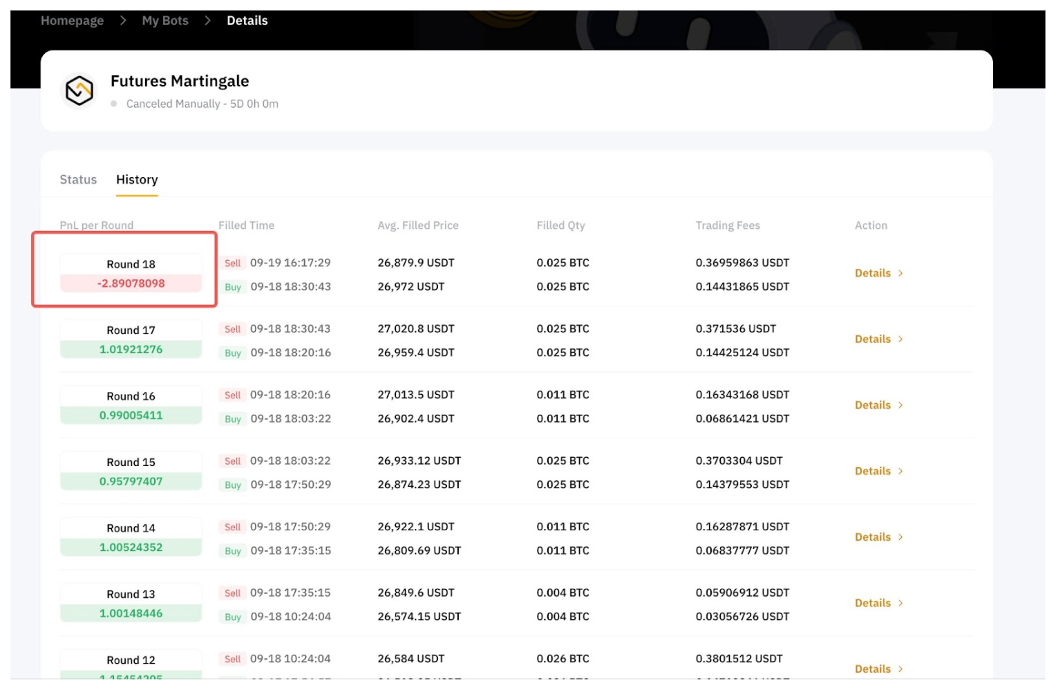 Quando o robô de Martingale de futuros estiver em execução, os lucros permanecerão dentro do robô, mas não serão usados como margem para a próxima rodada de trade. Os fundos serão transferidos automaticamente da conta do robô de trading do usuário para a conta de fundos após o encerramento da estratégia do robô de Martingale.