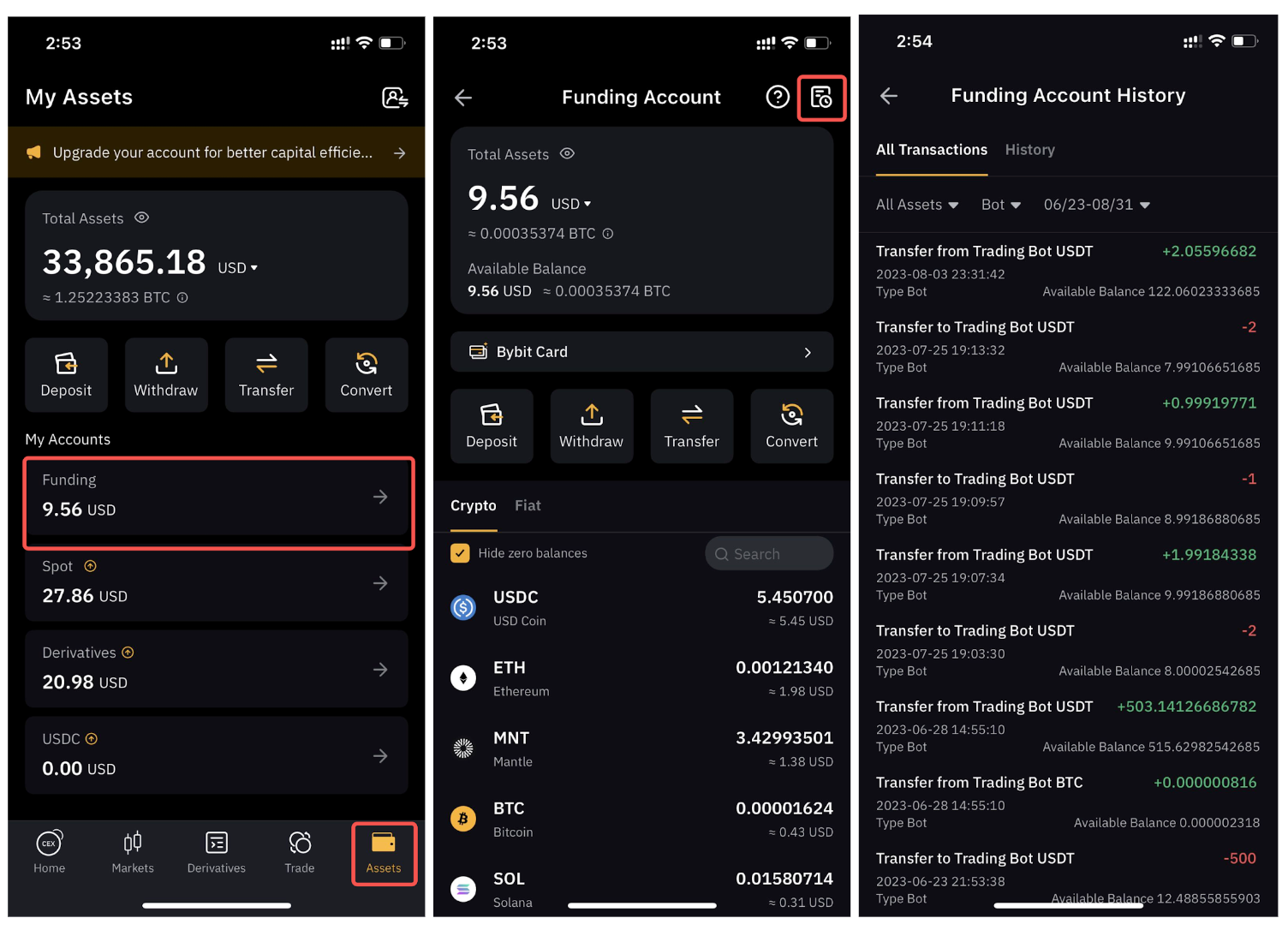 No aplicativo, vá para Ativos → Conta de fundos e toque no ícone Histórico localizado no canto superior direito, e você poderá ver os registros de transferência de ou para um robô de trading em seu Histórico da conta de fundos.