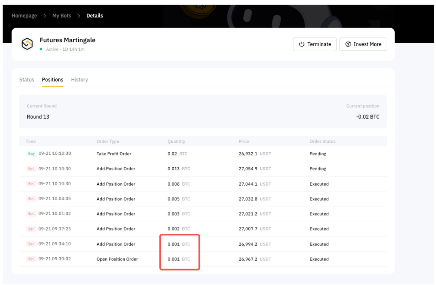 - Ao fazer trading com contratos perpétuos de USDT usando o robô de Martingale de futuros, há um requisito de tamanho mínimo da ordem que deve ser atendido. Ao calcular a margem de uma ordem, se a margem calculada cair abaixo desse requisito mínimo, o sistema irá arredondar automaticamente a quantidade da ordem para atendê-la. Esse processo de arredondamento pode resultar em uma situação em que a razão entre a última ordem e a ordem atual não corresponde ao multiplicador de posição predefinido.