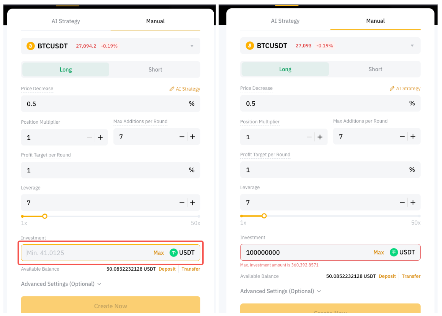 Depois que o robô for criado com sucesso, os parâmetros não poderão ser ajustados, a menos que o robô existente seja encerrado e um novo seja criado. Somente o stop loss pode ser ajustado após a criação do robô. No evento de margem insuficiente, você pode transferir mais fundos para seu robô de trading. No entanto, os fundos adicionados serão usados apenas para manter sua posição ou cobrir qualquer saldo insuficiente para enviar ordens. Isso não aumentará o tamanho geral da ordem do seu robô.