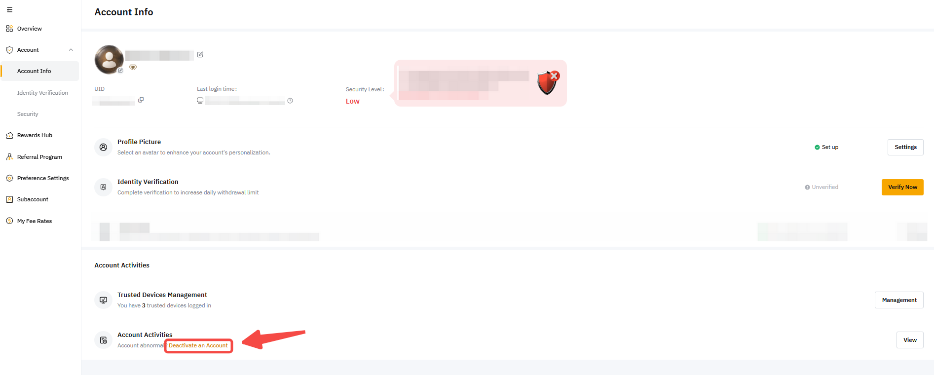 A Bybit lançou um recurso de desativação de conta de autoatendimento, que permite que os usuários desativem suas contas por conta própria por meio da página Conta, em vez de enviar solicitações de desativação de conta para o atendimento ao cliente da Bybit.