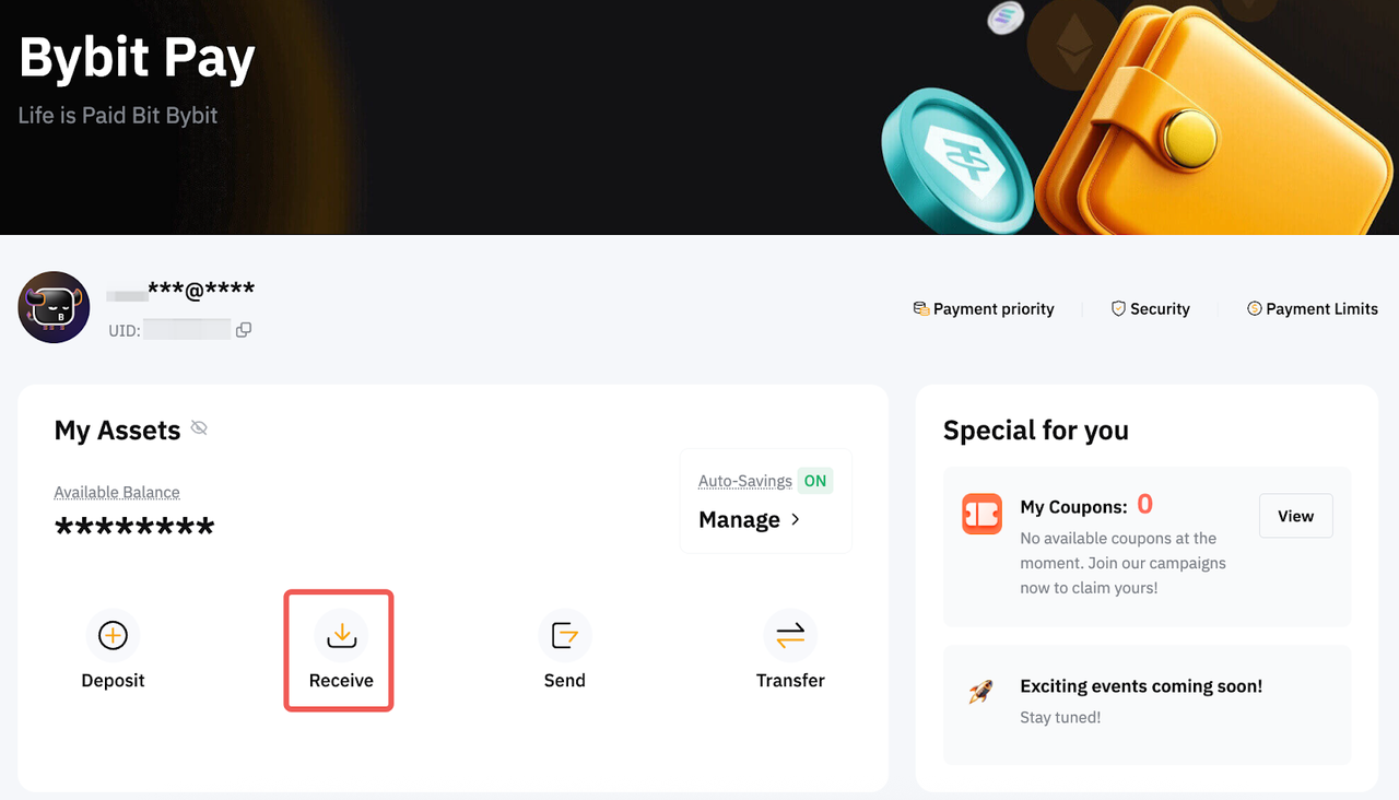 1º passo: Na página inicial da Bybit, clique em Finanças → Pagamento Bybit na barra de navegação para entrar na página Pagamento  Bybit. Em seguida, clique no botão Receber.