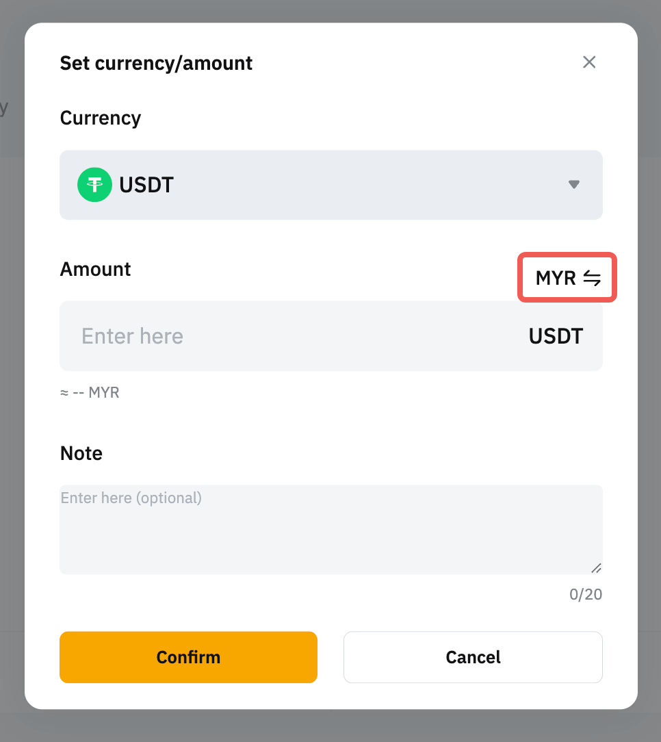 Antes de compartilhar o QR code, você tem a opção de definir o tipo de criptomoeda e o valor, e incluir uma observação. Além disso, você pode clicar no ícone  Swap para inserir o valor da moeda fiat e o valor de cripto equivalente calculado automaticamente será mostrado.