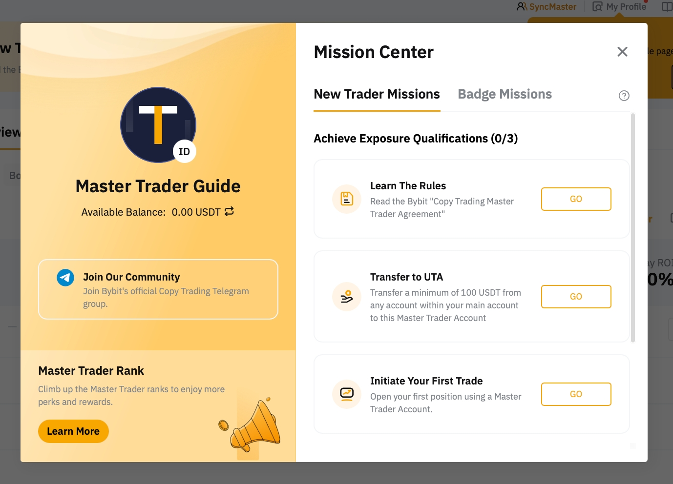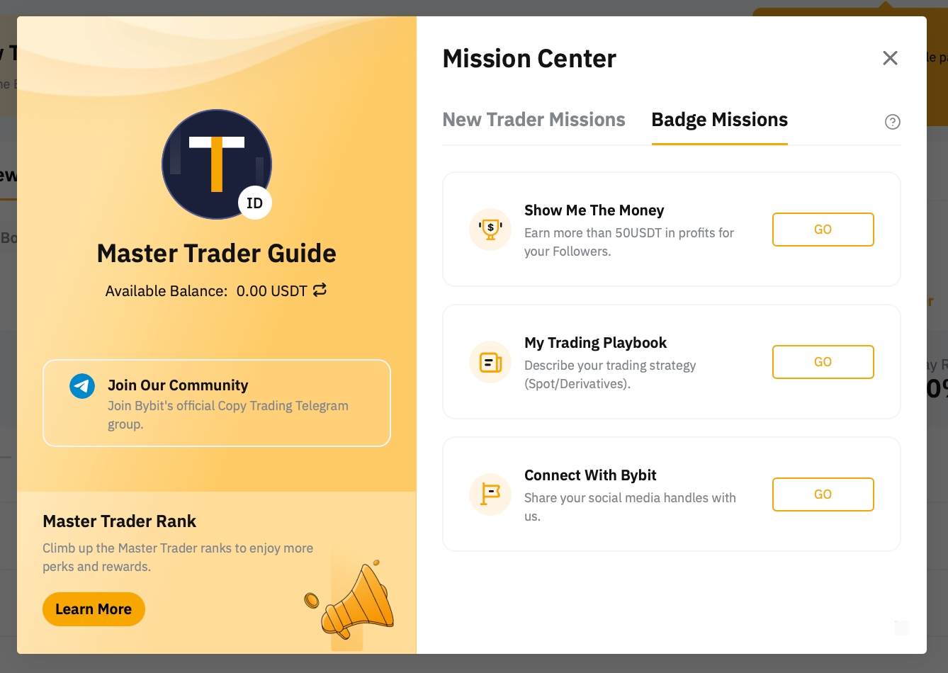 Upon successfully applying to be a Master Trader, it is required to complete the new Master Trader missions located within the Mission Center in order to be featured on the Bybit Copy Trading Recommended page.