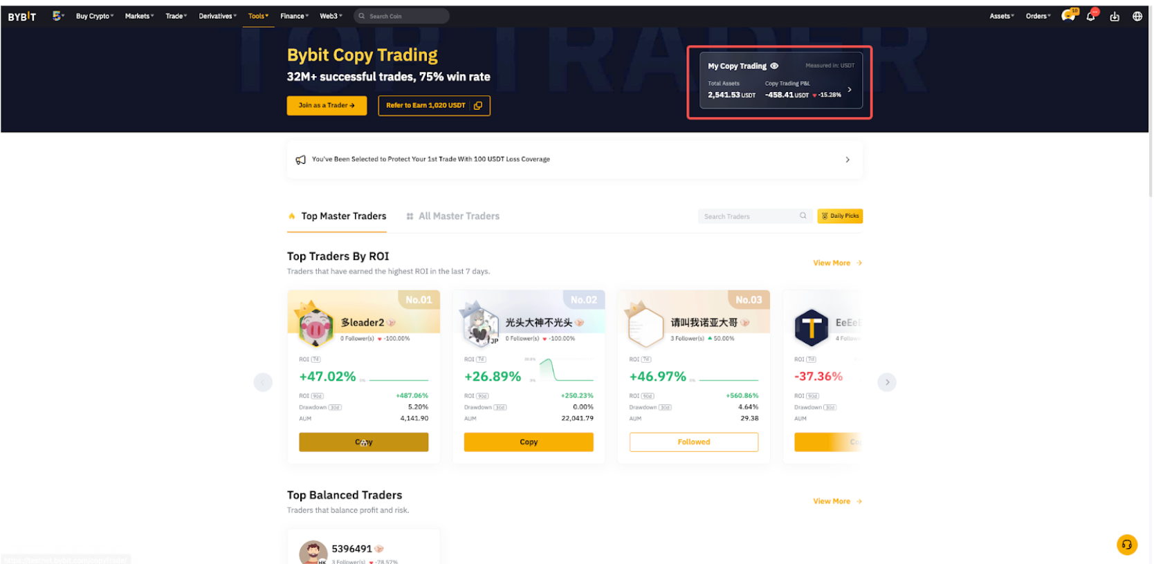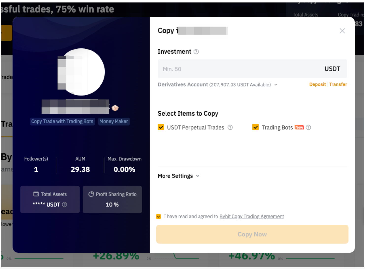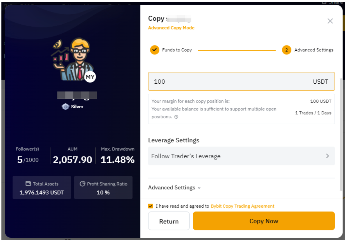 • Investment: The minimum investment amount is 100 USDT. Please note that your Master Trader can set a higher minimum investment amount required for copying, and you will be able to see the amount stated in the column.