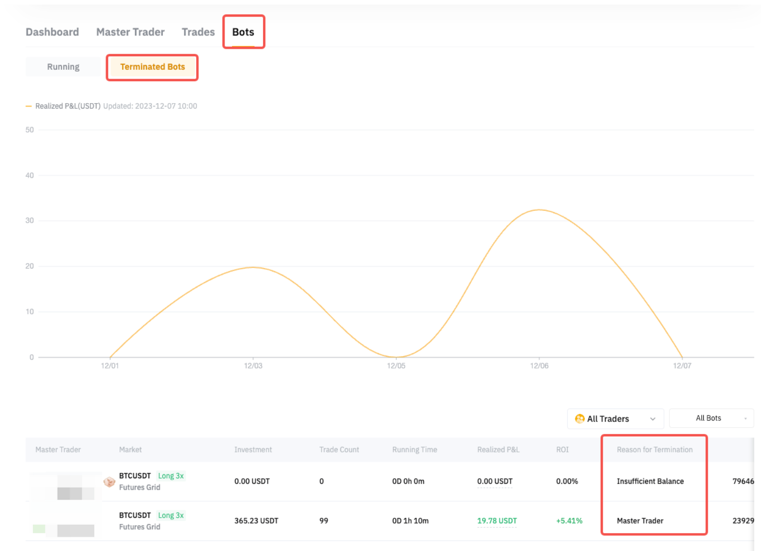 If you've opted to copy a Master Trader's existing bot, please note that significant changes in market conditions since the bot's creation may render it unsuitable for copying. In such cases, those bots will not be copied. On the Terminated Bots page, you can view the termination reason stated, mainly in: