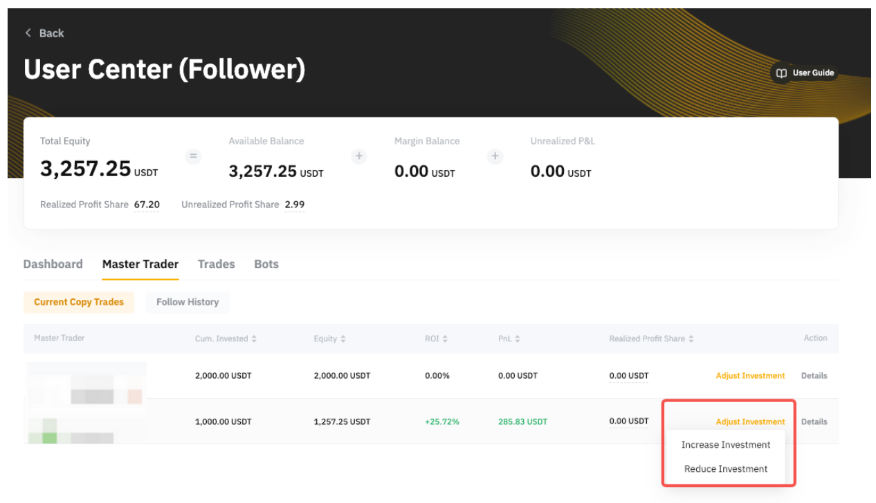 Step 1: Go to User Center (Follower) → Master Traders → Adjust Investment. Then, click on Increase Investment or Reduce Investment.