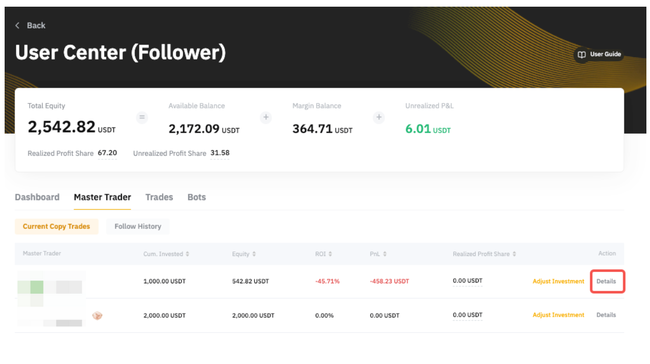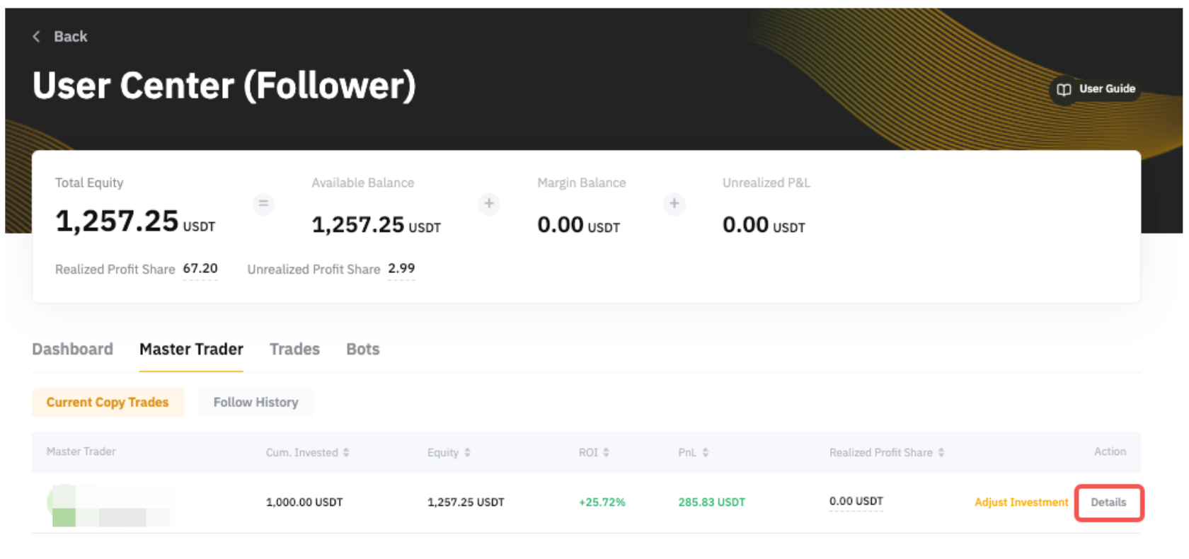 To cancel copying your Master Trader, go to User Center (Follower) → Master Trader → Current Copy Trades and click on the Details of the respective Master Trader you want to unfollow.