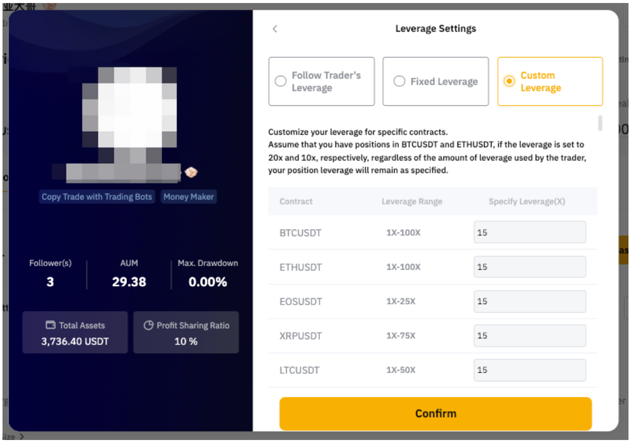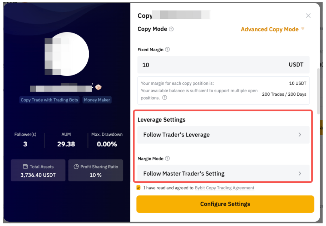 Margin Mode and Leverage Settings: To change the margin mode or leverage, you can refer to the steps above on how to edit your copy trade settings. Leverage change does not apply to Smart Copy mode as you will follow the Master Trader’s leverage.