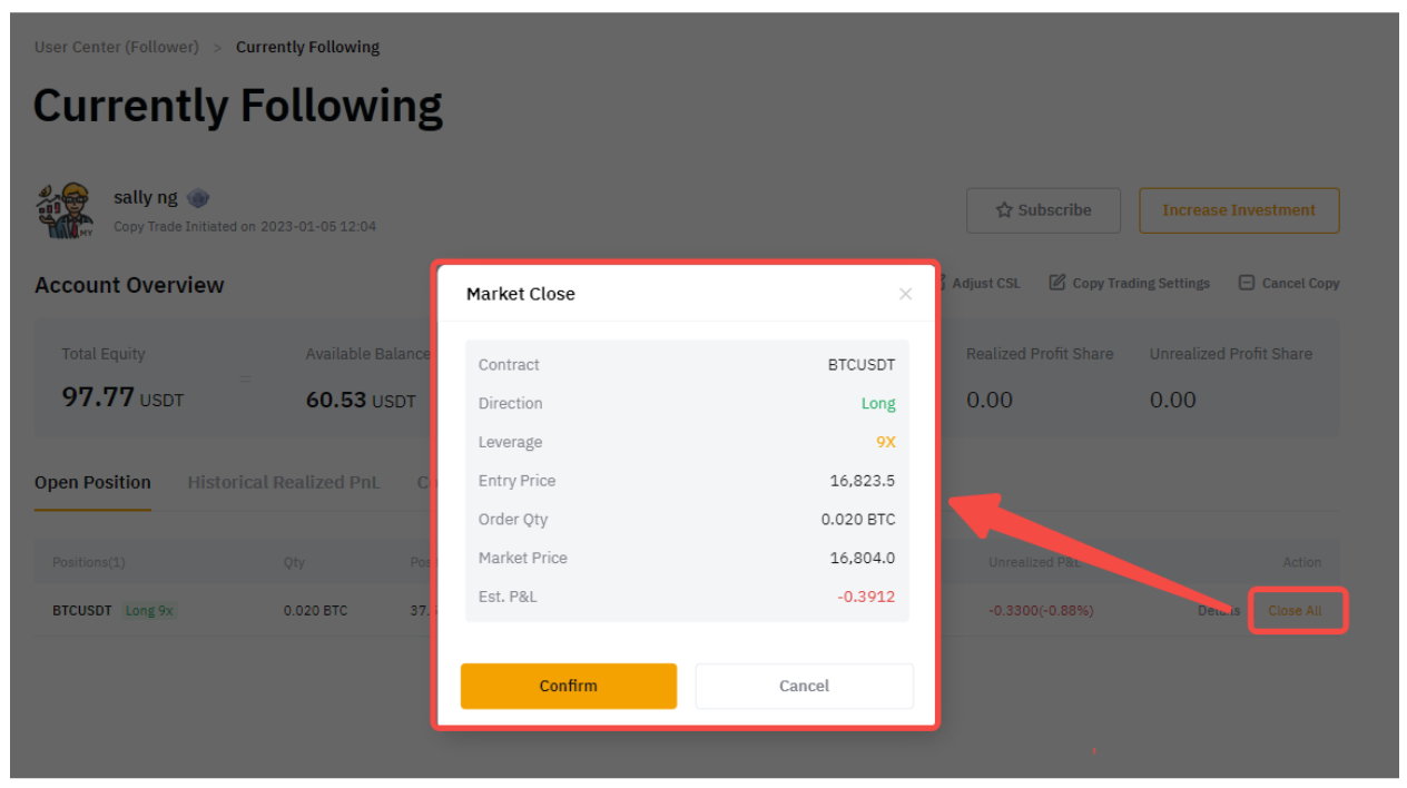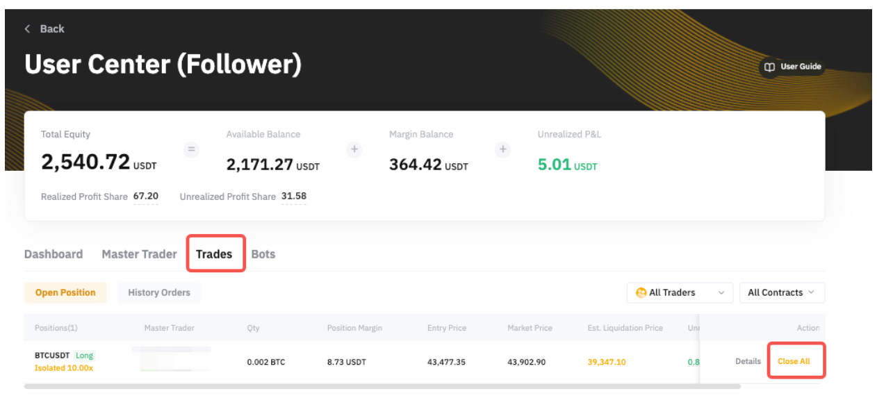 If you want to close the entire position under your Master Trader, please go to User Center (Follower) → Trades→ Open Position → and click on Close All to close the entire position at market price.