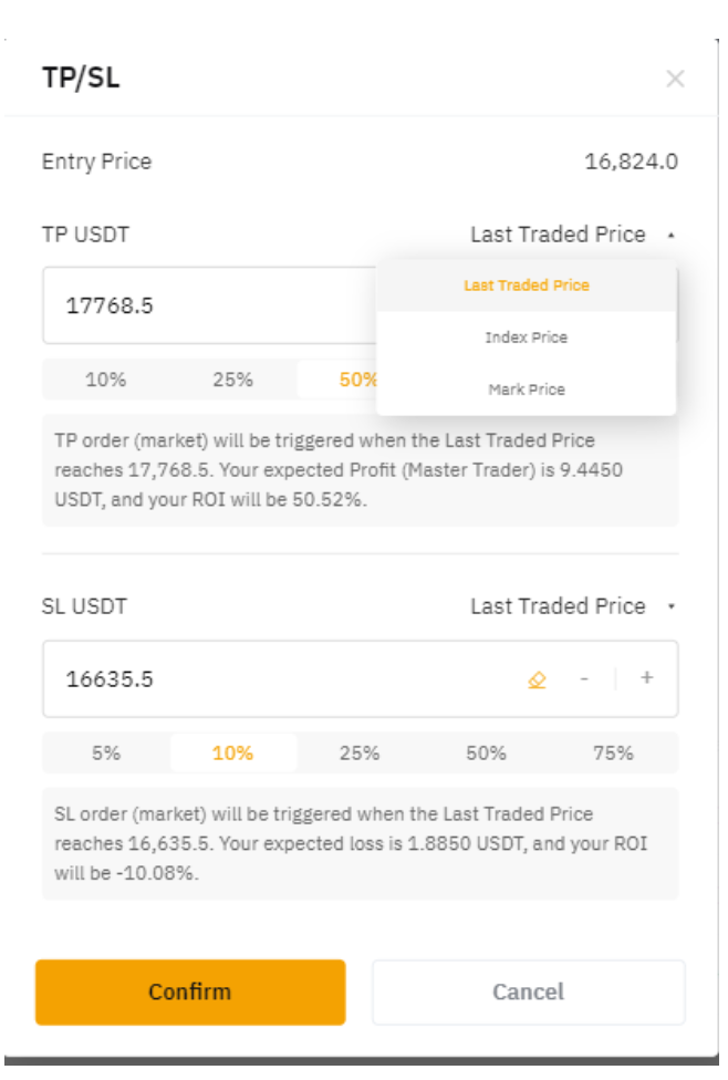 The percentage bar below the price refers to the ROI to be achieved. For example, Follower A has selected the 10% for Stop Loss and chose the Last Traded Price as the reference price. The system has automatically calculated $16,635.5 as the Stop Loss price. This means that when the Last Traded Price reaches $16,635.5, the SL order will be triggered and their ROI will be approximately -10%.
