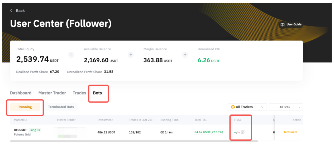 To set TP or SL for your Perpetual orders, go to User Center (Follower) → Bots → Running.