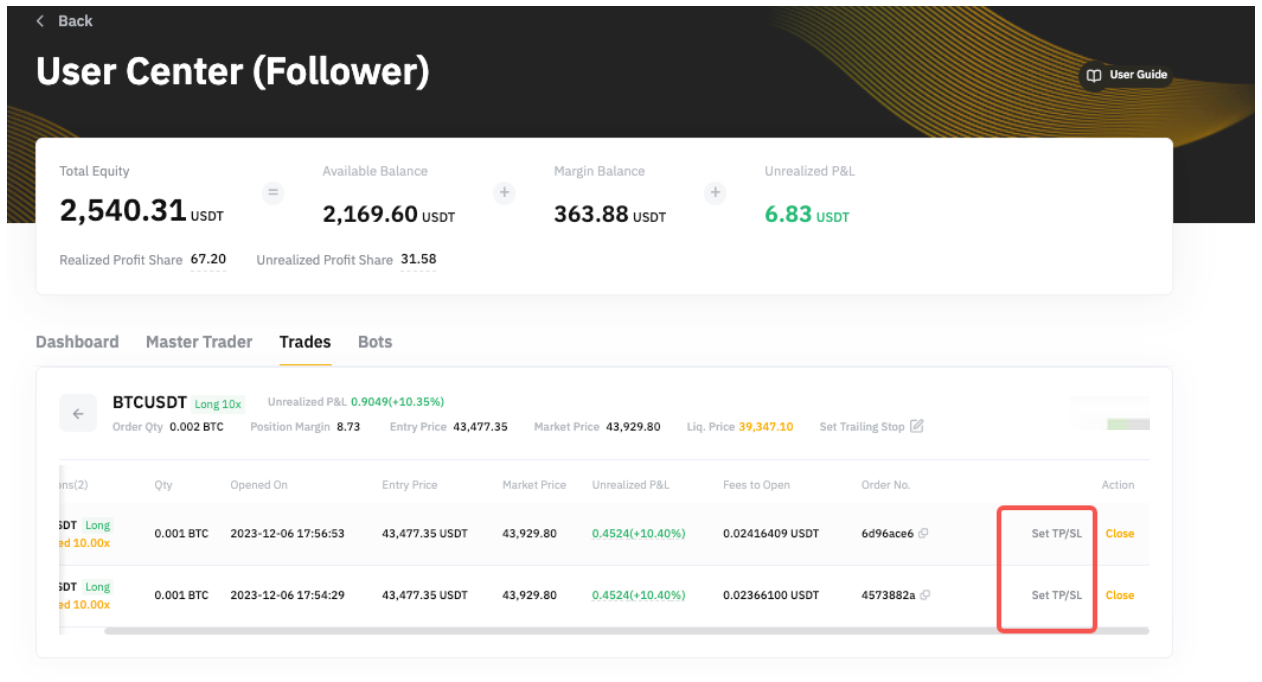 To set a TP/SL for your USDT Perpetual orders, go to User Center (Follower) → Trades → Open Position → Details. Click on Set TP/SL and you can enter your desired Take Profit or Stop Loss price. You can also select the reference price to trigger your TP/SL.