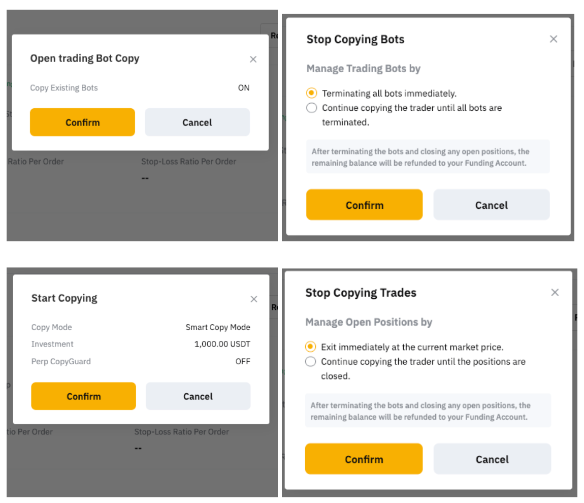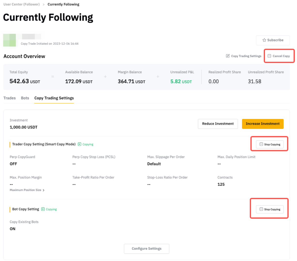 If you wish to cancel specific items, such as USDT Perpetual Trades or Trading Bots, you can click Stop Copying next to the Trader Copy Settings or Bot Copy Settings.